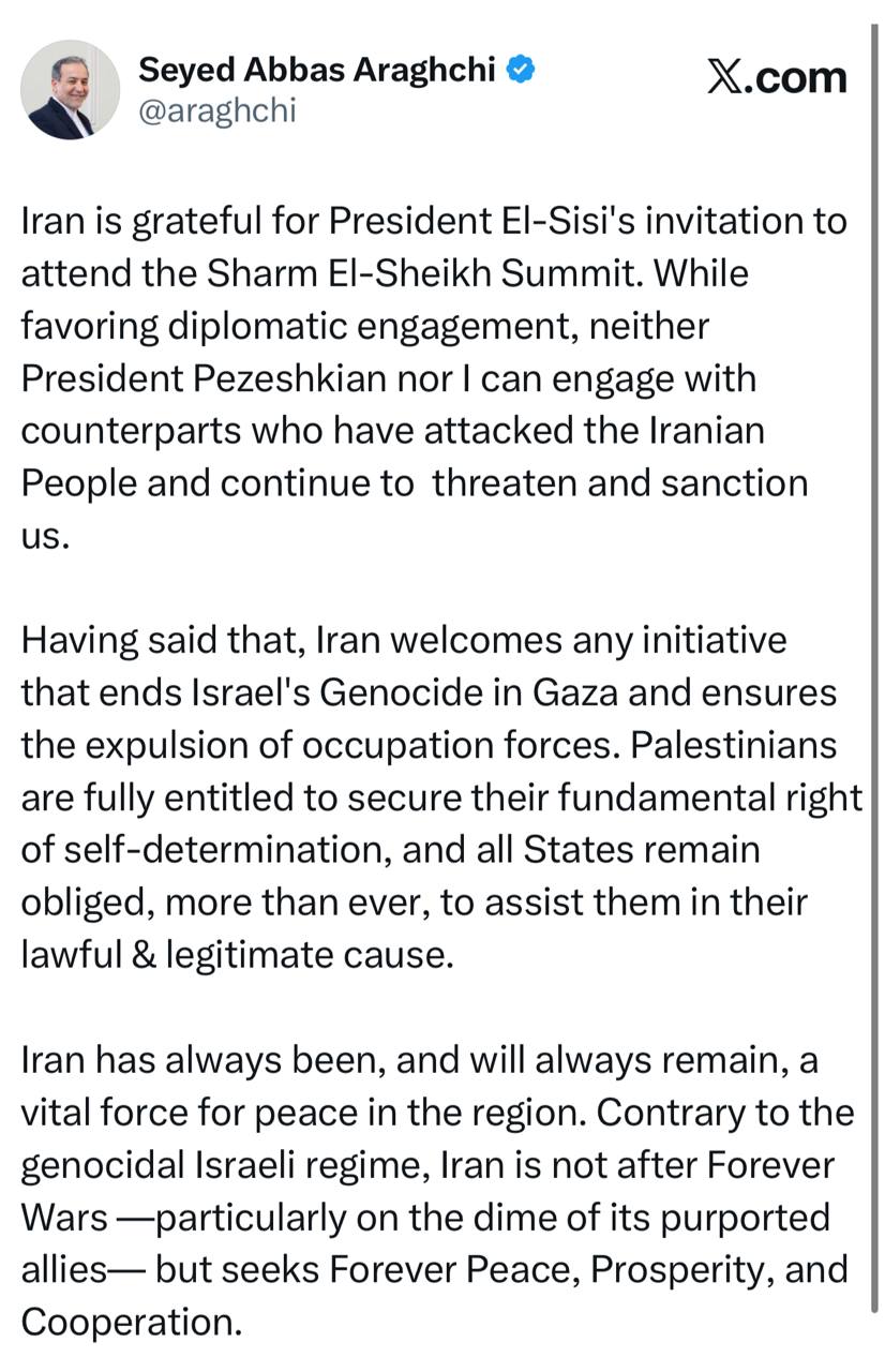 “Iran is grateful for President El-Sisi’s invitation to attend the Sharm El-Sheikh Summit. While favoring diplomatic engagement, neither President Pezeshkian nor I can engage with counterparts who have attacked the Iranian People and continue to threaten and sanction us,” Araghchi posted on X on Sunday night.